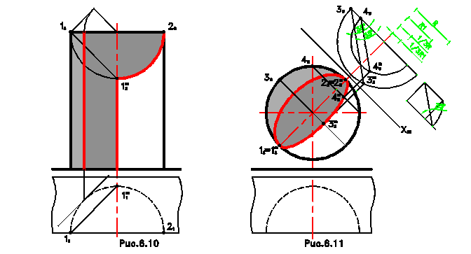 Последняя точка 1 дает тень в точке 12т. Далее строится тень от дуги окружности 1 – 2. Тень от точки 2 совпадает с самой точкой 2. Тени от промежуточных точек 3 и 4 позволяют построить падающую тень 12т - 22т, являющуюся дугой эллипса. На рис.6.10 представлена цилиндрическая ниша с закрытым верхом. После построения собственной тени строятся падающие тени от контура собственной тени, в роли которого выступают левая контурная образующая и горизонтальная прямая контура верхней плиты. Тень от контурной образующей, как и в предыдущем случае, совпадает с осью, а тень от профильно проецирующей прямой на цилиндрическую поверхность будет эллипсом, который проецируется в виде дуги окружности 12т - 22т.