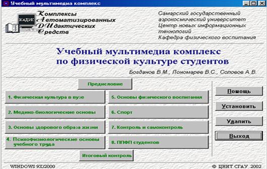 Технические требования CD-версия электронного учебника Общее описание Электронные компоненты комплекса Электронные компоненты комплекса содержат структурированные гипертексты, графические иллюстрации (150), анимации (15), видеоклипы (85), вопросы для тренинга и контроля знаний (более 200). Общий объем электронных материалов - 500 Мбайт. Более ранняя версия УМК (90-е годы) включает печатные учебные материалы и электронные интерактивные пособия с элементами мультимедиа для MS DOS по четырем темам: · основы физического воспитания; · атлетическая гимнастика; · оздоровительный бег; · самоконтроль физического состояния. Они все свободно тиражируются в Интернет на сервере ЦНИТ СГАУ http://cnit.ssau.ru/kadis/phculture.htm. Компьютер типа IBM PC под управлением WINDOWS 95/98/2000/NT, CD-привод, видеомонитор не ниже SVGA, звуковая карта и колонки (желательно, иначе видеоклипы будут проигрываться без аудиокомментариев). Для работы с учебником целесообразна следующая настройка экрана: · разрешение 800х600; · не менее 256 цветов. После установки диска в CD-привод и его раскрутки на экране компьютера появляется заставка диска с кнопками установки программного обеспечения на компьютер пользователя и кнопками, обеспечивающими навигацию по частям УМК (рисунок 5.1). При первой установке диска необходимо проделать следующее: 1) Провести инсталляцию диска с помощью кнопки Установить. Примечания · Для работы с Интернет-версией инсталляция не требуется. · Для Windows 2000, XP и ME устанавливаются только основные программы. · Для Windows 95/98 требуется провести инсталляцию основных программ и Microsoft Data Access Components 2.5. · Любой следующий запуск комплекса (повторная установка CD) не требует инсталляции. 2) Для начала работы с комплексом нажмите на кнопку CD- или Интернет-версия. При работе с комплексом не вынимайте диск из дисковода. Внимание! Гиперссылки могут не работать при латинском раскладе клавиатуры. В этом случае переключитесь на русский регистр. 3. После окончания работы с CD освободить занятое на диске С пространство можно по кнопке Удалить.