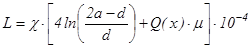 где: d (м) - диаметр проводника, а (м) - расстояние между осями проводников, F (x) - функция, учитывающая поверхностный эффект в проводнике, G (x) и H (x) - функции, учитывающие эффект близости проводников в паре, ΔR (Ом/км) - дополнительное сопротивление за счёт потерь энергии на образование вихревых токов в соседних парах и металлических оболочках кабеля. Индуктивность проводов кабельной пары характеризует их способность накапливать энергию магнитной составляющей электромагнитного поля и определяется по формуле: