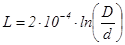 где: d (м) - диаметр внутреннего проводника, D (м) - диаметр внешнего проводника, μ - относительная магнитная проницаемость материала проводника, r (Ом/м) - удельное сопротивление материала проводника. Магнитное поле коаксиальной пары также замкнуто внутри неё, поэтому индуктивность определяется по формуле: