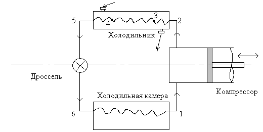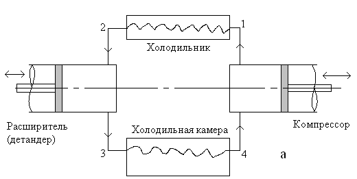 Рабочее тело сначала компримируют до какого-то давления (точка 1), далее направляют в теплообменник для охлаждения и подготовки к расширению (точка 2). Затем сжатый и холодный газ направляют в расширитель (детандер) (см. 7.4-а), где газ охлаждается до заданной температуры (точка 3), одновременно совершая работу, которую частично используют на стадии сжатия. Наконец, газ направляют в теплообменник в холодильной камере (точка 4). Здесь рабочее тело (хладоагент) забирает теплоту из холодильной камеры и далее идет на всас компрессора. На практике в установках умеренного холода вместо расширителя используют дроссель (см. рис. 7.4-б).