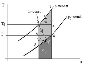 На рис. 7.5 изображен газокомпрессионный цикл в координатах T – s. Площадь внутри цикла эквивалентна затраченной работе w, площадь под кривой p = const процесса 3 – 4 (изобарное расширение) или процесса 3΄ - 4 (дросселирование) соответствует количеству теплоты («холода») q2, взятому газом от среды в холодильной камере. Это количество теплоты на языке «холодильщиков» называют холодопроизводительностью. Из рис. 7.5 видно, что холодопроизводительность q2 цикла с расширением в детандере больше, чем с дросселем. На рис. 7.5 внутри газокомпрессионного цикла изображен цикл Карно a2b4. Здесь Т0 – температура окружающей среды (атмосферы), Т – температура газа на выходе из теплообменника. Из рис. 7.5 видно несовершенство газокомпрессионного цикла по сравнению с циклом Карно. Действительно, площадь прямоугольника а2b4 много меньше площади фигуры 1234, а это затраты работы в установке. Одновременно видно, что количество отведенной теплоты q2 в цикле Карно много больше, чем в газокомпрессионном цикле.