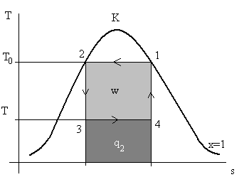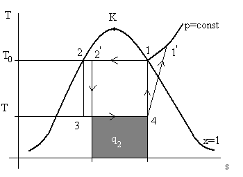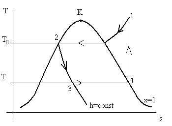 Технологическая схема парокомпрессионного цикла ничем не отличается от предыдущего цикла, только в качестве рабочего тела используются пары веществ, которые находятся в области влажного пара (см. лекцию 3). Иными словами, применяются вещества в состояниях, ниже критического (см. лекцию 3). Здесь в принципе можно реализовать наиболее эффективный холодильный цикл Карно (см. рис. 7.6).