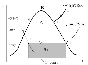 Рис. 7.6. Парокомпрессионный холодильный цикл Карно. Нумерация точек соответствует рис. 7.4-а.