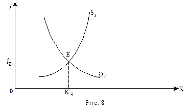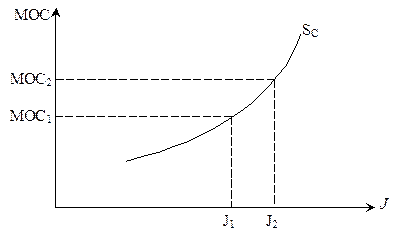 При этом, цена спроса на капитальный товар – это самая высокая цена, которую мог бы заплатить предприниматель. Она равна дисконтированной стоимости ожидаемого чистого дохода от использования приобретаемого, например, станка. Цена предложения капитального товара определяется как сумма издержек производства этого товара и затрат на его реализацию. Как правило, это – цена, указанная в прейскуранте, или продажная цена. Инвестиционное решение фирмы – суть не более чем сравнение цены спроса и цены предложения капитального товара. Когда цена спроса превышает цену предложения, дисконтированная стоимость выше цены прейскуранта, и фирме целесообразно делать закупки капитального блага. Но предприятие еще должно платить рыночную ставку процента на заемный капитал. Поэтому фирма, стремясь максимизировать прибыль, должна выбрать только такой проект, который даст норму прибыли (отношение чистой прибыли к вложенному капиталу, выраженное в процентах), большую, чем процентная ставка. Это воздействие спроса фирм на капитал и прибыльность проектов ведет к уравновешиванию прибыли на капитал и цены капитала. Следовательно, установившаяся в результате конкурентной борьбы норма прибыли на капитал будет равна величине процентной ставки. Рыночная процентная ставка выполняет две функции: 1) сдерживания нормы прибыли при ограниченном предложении средств производства; 2) побуждения людей к тому, чтобы жертвовать текущим потреблением и способствовать накоплению финансовых средств. Как же формируется спрос и предложение? Предложение капитала – это предложение инвестиционных средств. Субъекты, предлагающие капитал отказываются от самостоятельного альтернативного его применения. Отдавая деньги бизнесмену, они отказываются от открытия собственного дела, от поездки на курорт, покупки земли, другого текущего потребления. Чем большую сумму капитала предлагают в виде ссуды, тем большая его альтернативная стоимость, или предельные издержки упущенных возможностей (marginal opportunity cost – MOC). J- инвестиции (предложение капитала).