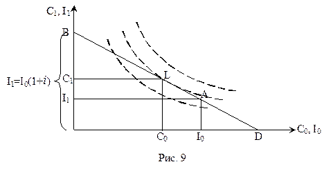 Пусть индивид имеет фиксированные размеры дохода: I0 – доход в текущем периоде, а I1 – доход в будущем периоде. При этом С0 – потребление в текущем периоде, а С1 – потребление в будущем периоде. Индивид может выбрать любую комбинацию объемов потребления в текущем и будущем периоде, лежащую на линии ВD (см. рис. 9) его бюджетного ограничения. Тем самым формирование предложения заемных средств со стороны индивида идет на основе его кривых безразличия в отношении будущего и текущего потребления и дохода; i на графике – ставка процента.