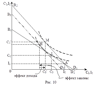 Теперь он выбирает не точку L, а положение, соответствующее точке М. Объем сбережений в данном случае увеличивается с величины С0I0 до C0'I0. Этот общий результат обусловлен действием двух эффектов: эффекта замены и эффекта дохода. При этом бюджетная линия D3В3 параллельна линии D2В2. Эта новая вспомогательная линия касается нижней кривой безразличия в т.Н. Переход от позиции L в позицию Н называется эффектом замены. Под влиянием эффекта замены объем сбережений увеличивается. Увеличение ставки процента означает удешевление будущего потребления относительно текущего. Индивид готов пожертвовать большим объемом текущего потребления ради увеличения потребления в будущем. Переход из точки Н в точку М называется эффектом доход. Повышение процентной ставки увеличивает доход индивида в форме процента. Поскольку и текущее, и будущее потребление являются Таким образом, под влиянием эффекта дохода объем сбережений сокращается. Эффект замены и эффект дохода имеют противоположную направленность. В