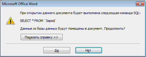 Создание главного и вложенных документов Особенности работы с основным документом При открытии файла основного документа, для которого уже добавлены поля слияния, появляется запрос (рис. 1.65). Обязательно следует нажать кнопку Да. В противном случае слияние будет произвести невозможно.