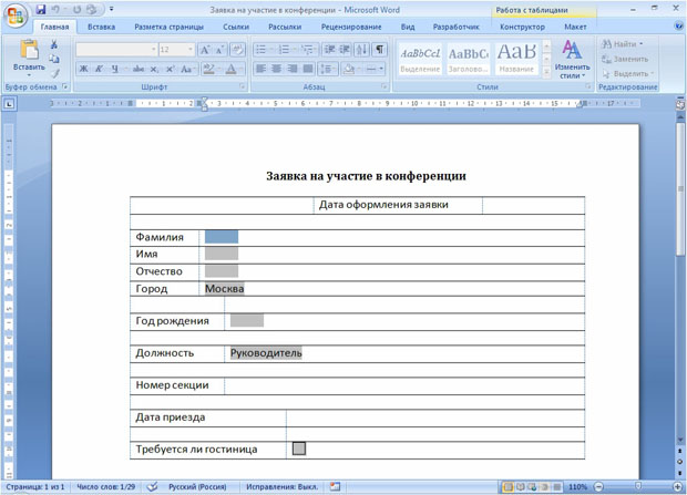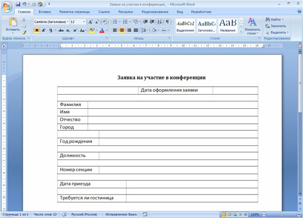 Например, можно создать электронную форму заявки на участие в конференции (рис. 1.74).