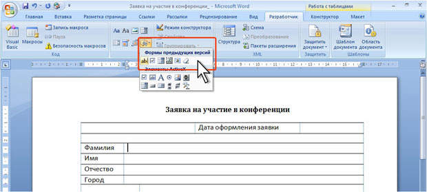 Во вкладке Разработчик в группе Элементы управления нажмите кнопку Инструменты из предыдущих версий и выберите элемент Поле (рис. 1.76).
