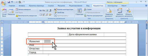 Заполнение формы возможно только после установки соответствующей защиты документа.