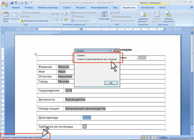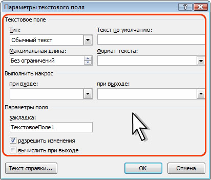 Для удобства пользователей формы к каждому полю можно добавить текст справки, который будет отображаться в строке состояния окна Word или выходить при нажатии клавиши F1.