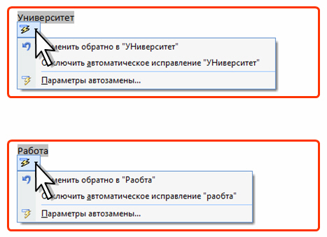 При наведении указателя мыши на автоматически исправленный текст появляется небольшое синее поле, которое при наведении на него указателя превращается в кнопку Параметры автозамены, а сам текст выделяется серым фоном (рис. 2.3). Можно отменить исправление либо включить или отключить параметры автозамены.
