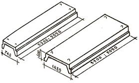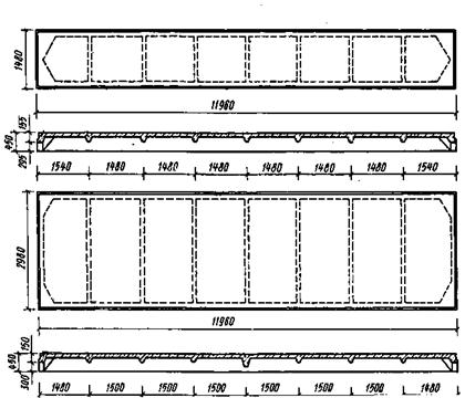 Промышленные здания с железобетонным каркасом перекрывают ребристыми железобетонными плитами, которые устанавливают на несущие элементы каркаса. Они бывают четырех типоразмеров: 6000×3000×300, 6000×1500×300, 12000×3000×450 и 12000×1500×450 мм (рис. 11).