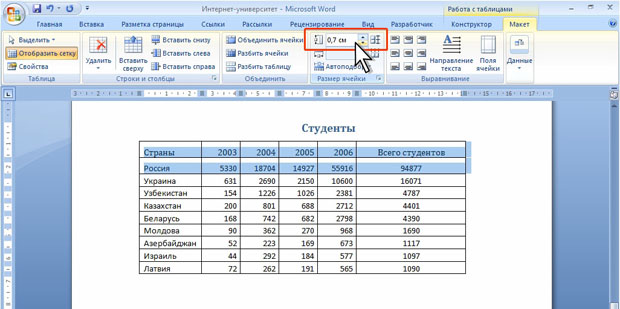 Если при этом держать нажатой клавишу ALT, то на вертикальной линейке будет указана высота каждой строки таблицы. Для точной установки высоты строк в таблице можно воспользоваться контекстной вкладкой Макет.
