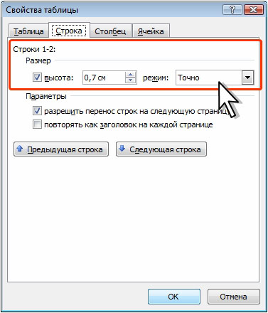 Высота строк обычно устанавливается в режиме автоподбора. Например, если установлена высота строки 0,7 см, то при увеличении количества текста или размера шрифта в ячейках строки высота будет автоматически увеличиваться. При уменьшении количества текста высота строки будет автоматически уменьшаться, но не будет меньше установленного значения (0,7 см). Режим автоподбора можно отключить.