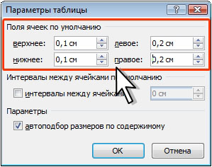 Настройка полей ячеек Поля ячейки определяют расстояние от границ ячейки до текста в ячейке. По умолчанию установлено левое и правое поле 1,9 мм, а верхнее и нижнее - 0 мм. Увеличение полей ячеек облегчает восприятие таблицы. Уменьшение - делает таблицу более компактной.