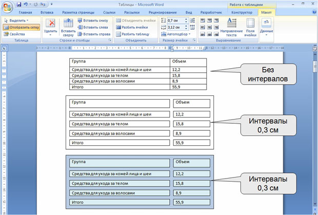Установка интервалов позволяет создать пустые промежутки между ячейками (рис. 2.128).