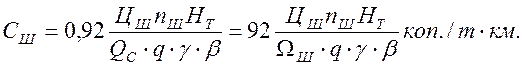 где ЦШ – цена одной шины (комплекта), грн; nШ – число однотипных комплектов шин (без учета запасных); lШ – пробег шин в данных дорожных условиях, км; 0,92 – коэффициент, учитывающий увеличение пробега шин после ремонта на 25% и затраты на ремонт шин (с восстановлением протектора), составляющие около 15% стоимости новых шин (1,15:1,25=0,92). Анализ показывает, что пробег шин прямо пропорционален суммарному расходу топлива QC: lШ = 100QC / HT, где HT – расход топлива в л/100 км. Если ввести обозначение 100QC=WШ, то