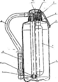 Рис. Огнетушитель ОПУ-5 1- корпус; 2 — накидная гайка; 3 —головка; 4 — источник рабочего газа; 5 - сифонная трубка; 6 — газоотводящая трубка, 7 — ручка запуска; 8 — игла; 9 — гибкий шланг; 10 — пистолет-распылитель; 11 —чека