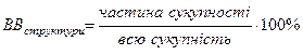 Розглянемо докладно кожен вид відносних величин. 1. Відносна величина структури характеризує склад сукупності. Являє собою процентну величину окремої частини сукупності до цілого, яке приймається за 100 %. Так, відношення частки до цілого називається питомою вагою і виражається у відсотках. Обчислюється діленням кожної частини сукупності на всю сукупність і виражається у відсотках або коефіцієнтах.