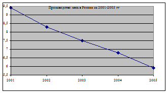 Как видим, средние абсолютные и относительные изменения, найденные обоими способами, равны. Из среднего относительного изменения находим средний темп изменения как 0,89-1= -0,11 или (–11) %, что свидетельствует о среднем спаде явления. Значит, согласно примеру, за пять лет с 2001 по 2005 годы производство мясо в России уменьшалось в среднем на 11 % в год. Для выявления тренда построим график Y(t):
