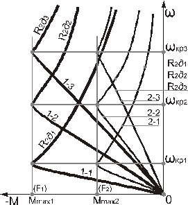 Figure 3.47 – Mechanical characteristic of dynamic braking with independent excitation. All characteristics originate from the same point 0 ( Characteristics are presented for two values of stator mmf The value of maximal braking moment Critical speed value (critical sliding), vice versa, is alike for one and the same value of rotor active resistance and doesn`t related to changing the value of stator mmf. Likeness of mechanical characteristics of braking and motor modes is only visual. Their quantitative discrepancies are significant. With one and active rotor resistance critical sliding in motor mode is significantly higher then critical sliding of dynamic braking, since in dynamic mode alternating current of stator winding is absent. It means that inductive resistance