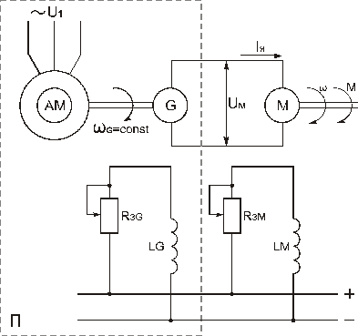 Scheme of such system called the generator-motor system is shown below. Here armature of motor is directly (metallic) connected to the armature of generator (without starting, regulating and commutating apparatuses). Excitation circuit of machines is feeding from the separate source (rectifier of exciting machine). Generator G together with its driving motor (asynchronous motor AM) make up an electromachine converter П – controlled converter of unregulated alternating supply-line voltage U1 (that feeds AM) into regulated constant voltage Uм (that feeds the driving motor M) – controlled rectifier. Voltage regulation Uм for feeding the motor armature realized due to change of generator excitation current by means of resistor R3G. Voltage Uм may be obtained quite small (at minimal generator excitation) and may be increased to the maximal value (to the allowed limit of generator magnetic system saturation). But it isn’t the limit of motor speed rise M.