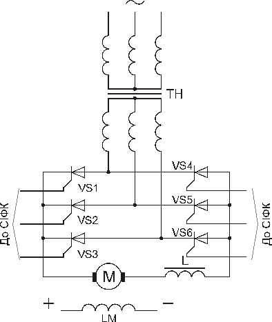 Static converter – motor system (SC-M) The basic type of controlled converters in modern controlled DC electric drive is semi-conducting static thyristor or transistor converters. They are constitutes the controlled reversible or irreversible rectifiers assembled by zero- or bridge single-phase scheme of three-phase scheme. Consider the principle of operation, features and characteristics of the thyristor converter – motor system by the scheme where the three-phase irreversible controlled thyristor rectifier assembled by the bridge scheme is chosen as converter. Converter has matching transformer TH (see the figure), six thyristors VS1-VS6, system of impulse-phase control SIPC (СИФУ) and smoothing reactor L.