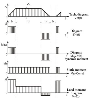 Load diagrams of EDs characterize dependence of rotation moment, current or power, which the motor has, on the time. Load diagrams are using to estimate the overload ability of ED, to compare it with short-time load for the specific type of EM and to check previously chosen motor to the heating. Load diagram takes into account static and dynamic loads, that ED operates in the operation cycle with. Static loads are specified in accordance to the technology data, which characterizes the operation mode, and dynamic loads are measured by inertia moments,which appears to provide appropriate angular accelerations. Load diagrams is appropriate to consider for the specific devices. For example: electro drive of mine winder with balanced cable. Kinematic scheme is the following:
