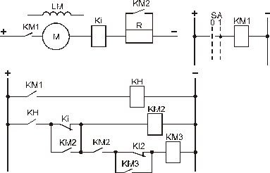 Applied here is the current relay of angular acceleration KI and as well for simplification the starting resistor for one step. When energizing linear contactor KM1 with the help of command apparatus SA simultaneously with armature circuit the coil of blocking relay KN is energized (the coil of current relay KI is energized in the armature coil). Contact KI is deenergized before contact KH of blocking relay energizing, that`s why the coil of starting contactor KM2 is deenergized (its contact KM2 is opened and the motor is energized by resistor R). Contact KH of blocking relay doesn’t allow energizing the starting contactor KM2 just after energizing of linear contactor KM1. Releasing current of current acceleration relay KI is equal to current I2 that results to energizing of starting contactor KM2, which is to shunting of starting resistor R. At the next current ripple from I2 to I1 the starting contactor KM2 doesn’t open due to the fact that current relay KI is shunted with contact KM2 of starting contactor. The advantage of this method is that the switching of starting resistor occurs at a given current value I2 and doesn’t depend on oscillations of voltage supply at starting.