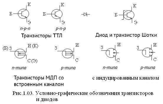 2. Теоретически число входов (Х1, Х2, … Хn) элемента И-НЕ может быть неограниченным, практически их выполняют не более 8, так как дальнейшее увеличение их ухудшает динамические характеристики элемента. 3. Схемная реализация базового элемента ТТЛ имеет много разновидностей, направленных на улучшение его динамических характеристик. 4. Диоды на входах VT1 (VD1 и VD2) предназначены в частности для защиты элемента от напряжения обратной заданной полярности. 5. Параллельное включение нескольких выходов таких элементов недопустимо, так как при реализации функции разными элементами возможно короткое замыкание по выходам. Система обозначений транзисторов и диодов в соответствии с ГОСТ 2.730-73 приведена на рис. 1.03.