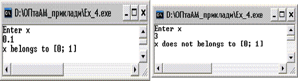 Решение задачи с использованием условного оператора выглядит следующим чином. program Ex_4; var x: real; begin writeln('Enter x'); readln(x); If (x >=0)and(x <= 1) then write ('x belongs to [0; 1]') else write ('x does not belong to [0; 1]'); end.