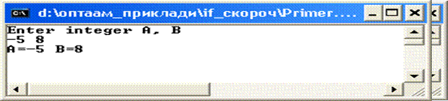 program Primer; var A,B:integer; begin writeln('Enter integer A, B'); readln(A,B); If A>0 then begin A:=A+1; B:=B*2; end; writeln('A=',A,' B=',B); readln end.