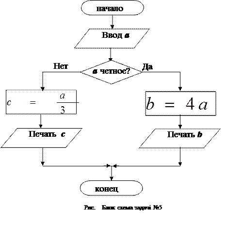 Решим задачу. Данная целое значение а. Если число а – четное, то вычислить значение переменной b (b=4a), иначе вычислить переменную c (