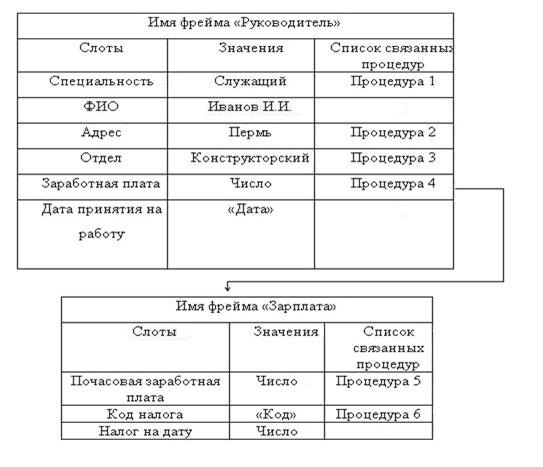 Фреймы – это фрагменты знания, предназначенные для представления стандартных ситуаций. Термин " фрейм " (Frame – рамка). Фреймы имеют вид структурированных компонентов ситуаций, называемых слотами. Слот может указывать на другой фрейм, устанавливая, таким образом, связь между двумя фреймами. Каждый фрейм, как структура хранит знания о предметной области (фрейм –прототип), а при заполнении слотов знаниями превращается в конкретный фрейм события или явления. Фреймы используются в системах искусственного интеллекта (например, в экспертных системах) как одна из распространенных форм представления знаний. Фреймы предназначены для представления стереотипных ситуаций. Фреймы объединяются в сеть. В них указывается: каким образом фрейм реагирует на изменение ситуации, что следует делать далее. Основная идея фрейма – сосредоточение всей информации об объекте в одной структуре данных. Рассмотрим пример фрейма " Руководитель " (рис.15). Реквизиты, указывающие характеристики объекта, называются слотами. С некоторыми слотами фрейма связаны процедуры, автоматически выполняемые при определенных условиях. Во фрейме "Руководитель" указанные процедуры 1, 2, 3, 4 активизируются при изменении значений слотов. Слот "Заработная плата" связан с фреймом "Зарплата", который активизируется с помощью процедуры 4. Она включается при изменения слота "Заработная плата", после чего включается процедура 5 для изменения значения слота "Заработная плата", так изменится слот "Почасовая заработная плата".
