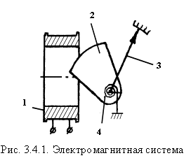 Приборы этой системы (рис. 3.4.1) имеют неподвижную катушку - 1 и подвижную часть в виде стального сердечника - 2, связанного с индикаторной стрелкой - 3 противодействующей пружины - 4. Измеряемый ток, проходя по катушке, намагничивает сердечник и втягивает его в катушку. При равенстве вращающего и тормозящего моментов система успокоится. По углу поворота подвижной части определяют измеряемый ток. Среднее значение вращающего момента пропорционально квадрату измеряемого тока: