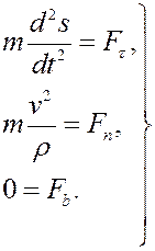 Если движение точки задано естественным способом, то равенства (1), или (2), нужно проектировать на оси естественного трёхгранника: касательную t, главную нормаль n и бинормаль b. Вспоминая проекции ускорения точки на эти оси, получим из (1), или (2)