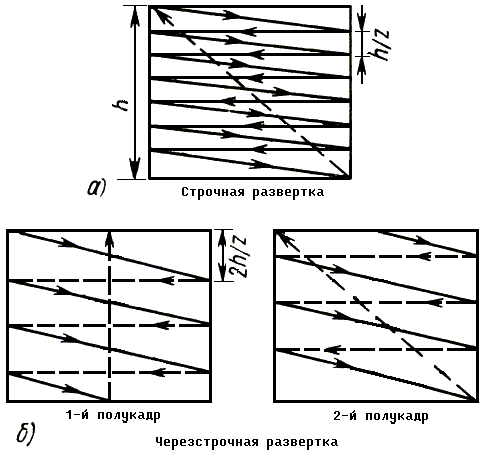 Рис.3.2. Принцип построчной (а) и через строчной развезвертки (б)