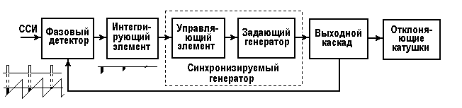 Такой метод управления является параметрическим, потому что под действием управляющего напряжения изменяется какой-либо параметр задающего генератора. Два сравниваемых сигнала – с выхода собственно генератора развертки и выделенные из ВС ССИ – поступают на два входа фазового детектора, где сравниваются их фазы и вырабатывается напряжение, пропорциональное разности мгновенных значений этих фаз. Из-за импульсного характера сравниваемых напряжений сигнал на выходе также будет импульсным, поэтому ставится интегрирующий элемент. Он в значительной мере подавляет действие импульсных помех, так как среднее изменение фазы, вызванное такой помехой, за достаточно большой промежуток времени равно нулю. Таким образом, на выходе интегрирующей цепи образуется постоянное или медленно меняющееся напряжение, величина и знак которого соответствуют разности фаз сравниваемых напряжений. Это напряжение воздействует на управляющий элемент, который перестраивает частоту работы генератора (например, изменяется напряжение смещения на базе транзистора ЗГ, а, следовательно, изменяется момент его открывания или закрывания).