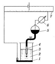Схема полярографической установки. Анализируемый раствор 2 находится в электролизере 3, на дне которого имеется слой ртути 1, являющийся анодом. Часто в качестве анода используют насыщенный каломельный электрод. Катодом служит ртутный капающий электрод 4, соединенный с резервуаром ртути 5. Внешнее напряжение, подаваемое на электроды, можно плавно менять с помощью делителя напряжения 7 и измерять при этом гальванометром 6 силу тока, проходящего через раствор. При вытекании из капилляра ртути образуются висячие капли диаметром 1 мм, периодически отрывающиеся от капилляра. При смене ртутных капель поверхность электрода постоянно обновляется. Это гарантирует чистоту поверхности и отсутствие загрязнения восстановленными ионами. Этот электрод имеет малую поверхность, которая во много раз меньше площади поверхности электрода сравнения. Внешнее напряжение, налагаемое на полярографическую ячейку, расходуется на изменение потенциала ртутного капающего катода, потенциала анода и преодоление сопротивления раствора (омическое падение напряжения IR): Евнеш. = Екат. – Еан. + IR Т.е. на поляризацию индикаторного электрода расходуется только часть налагаемого напряжения. Но при условии, что площадь поверхности анода во много раз больше, чем у катода, поляризацией анода можно пренебречь. Из-за малой плотности тока его потенциал будет оставаться практически постоянным. Если сопротивление раствора уменьшить, то слагаемым IR можно практически пренебречь. Для снижения сопротивления в анализируемый раствор вводят избыток индифферентного электролита, или просто фона. В качестве фонов используют соли щелочных и щелочноземельных металлов, растворы кислот, щелочей, а также разнообразные буферные смеси. При этих условиях можно считать, что практически всё налагаемое на ячейку внешнее напряжение расходуется на изменение потенциала индикаторного электрода, т.е. Евнеш. ≈ Екат. Электроды подсоединены к полярографу. Полярограф обеспечивает на электродах возрастание потенциала от 0 до –3 В или до +3 В.