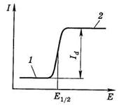 1 – остаточный ток; 2 – диффузионный ток Потенциал, отвечающий току I=½Id, называется потенциал полуволны Е½. Его числовое значение показывает, насколько легко восстанавливается на электроде данное вещество. Это качественная характеристика вещества; потенциал полуволны непосредственно связан со стандартным потенциалом данной окислительно-восстановительной системы Для количественного определения электроактивных веществ используется прямая пропорциональная зависимость между диффузионным током (или высотой волны) и концентрацией деполяризатора. Зависимость диффузионного тока Id от концентрации иона С выражается уравнением Ильковича: