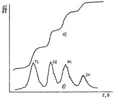 Если вместо интегральной полярограммы, т.е. зависимости в координатах I – E регистрировать дифференциальные полярограммы в координатах dI/dE – E, то вместо S-образных волн будут наблюдаться пики. Это дает возможность улучшить разрешающую способность полярографического метода.