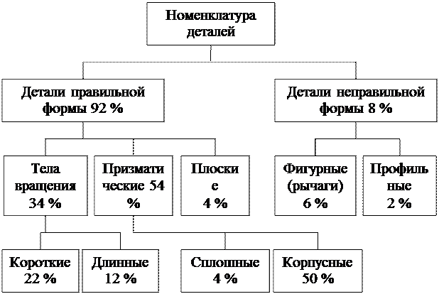 Организационная основа ГПС – это групповое производство, являющееся формой организации дискретных (прерывных) производственных процессов, экономико-организационной основой которых является целевая подетальная специализация участков и цехов, а технологической составляющей – унифицированная групповая форма организации технологического процесса (ТП). Основа технологической унификации ТП – классификация деталей и их поверхностей по конструктивно-технологическому признаку на базе общности оборудования, наладки и инструментальной оснастки, например классификация деталей машиностроения (рис. 3). Группирование деталей для одновременной обработки на одной ГПС включает три группы условий: а) геометрические параметры изделий, которые в основном определяют типоразмер включаемых в ГПС станков, при этом подобие формы или идентичность технологических переходов перестают играть решающую роль в составлении деталей, главными критериями становятся габариты и масса; б) технологические параметры, определяющие возможность полной обработки каждой группы деталей на одном станке в одну-две операции или необходимость их доработки на других станках системы;