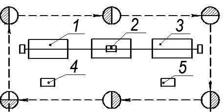 Рис. 5. Компоновочные схемы РТК при механической обработке деталей (продолжение): 1 – металлорежущие станки; 2 – промышленный робот; 3 – накопитель; 4 – рольганг