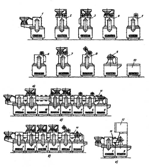Рис. 33. Набор модулей и варианты их компоновки в автоматические линии различного назначения