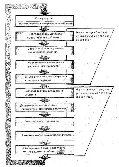 На основе определенной цели решения формулируются критерии-требования и учитываемые условия. Все альтернативы не удовлетворяющие критериям-требованиям, автоматически отсеиваются, а оставшиеся сопоставляются по соответствию учитываемым условиям. При отборе вариантов решения применяются и количественный анализ, и эвристические методы. На стадии выбора окончательного варианта и принятия решения из ряда возможных решений выбирается лучшее. Для этого подробно прорабатывается каждый вариант. Оценка вариантов решения в целях окончательного выбора одного из них производится на основе совокупности критериев, с учетом всех внешних и внутренних факторов. При проработке вариантов решения применяются методы моделирования, экстраполяции, экспертных оценок. При наличии времени и возможностей могут применяться эксперименты (экономические, социальные технологические и комбинированные). Решающее слово при выборе окончательного варианта принадлежит руководителю. Его роль состоит не в том, чтобы во всех случаях выбирать в чистом виде один из предлагаемых вариантов, полностью отбрасывая остальные. Он должен уметь синтезировать из разных вариантов решений одно, наиболее целесообразное, руководствуясь общими целями деятельности управляемой' системы. Фаза реализации управленческого решения включает в себя стадии разработки плана реализации решения, доведения его до исполнителей и контроль за исполнением решения. Условия для успешной реализации управленческого решения создаются еще на стадиях его подготовки и принятия. Уже в решении должно быть предусмотрено: кто, где, когда и каким образом выполняет ту или иную задачу. Это создает необходимые организационные предпосылки для реализации решения. Реализация принятого решения требует разработки организационного плана, направленного на достижение цели данного решения. В организационном плане весь объем работ расчленяется по объектам, задачам и интервалам времени. Для выполнения каждой группы работ подбираются исполнители соответствующей квалификации и в нужном количестве. Особое внимание должно быть уделено подбору руководителей работ. После разработки организационного плана решение доводится до исполнителей. При этом разъясняется смысл и значение принятого решения, его возможные результаты. Нередко для выполнения решения требуется обучение новым методам работы. Тогда одновременно с пропагандистской проводится большая инструктивно-методическая работа. В реализации решения важнейшую роль играет контроль за ходом его выполнения. Цель контроля состоит не только в своевременном выявлении отклонений от заданной программы, но и в их предупреждении. Эффективный контроль невозможен без учета работы по реализации решений. Используются все виды учета: статистический, бухгалтерский, оперативный. Хорошо налаженный контроль представляет собой ту обратную связь в системе управления, без которой немыслим нормальный процесс регулирования, своевременного устранения возникающих трудностей, узких мест. В ходе контроля может выявиться необходимость внести в принятое решение коррективы, а иногда и принять новое решение. Причиной этого могут быть плохая организация выполнения решения, резкие изменения в обстановке, вызванные внешними причинами, ошибки, допущенные в само