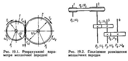 В деяких випадках регулювання двигуна можливо, але недоцільно з економічних міркувань, оскільки за межами номінального режиму роботи ККД двигунів істотно знижується. Maccа і вартість двигуна при однаковій потужності зменшуються із збільшенням кутової швидкості його валу. Механічною передачею називають механізм, що передає енергію від двигуна до робочого органу машини з перетворюванням параметрів руху. Обертовий рух найпоширеніший у машинах в порівнянні з іншими видами руху: існує можливість здійснення неперервного та рівномірного руху; невеликі втрати на тертя в спряженнях обертових деталей; порівняльна простота та компактність деталей, що забезпечують обертовий рух. Безпосередній зв'язок двигуна з робочим органом машини використовується рідко, наприклад у відцентрових насосах, де вал електродвигуна безпосередньо з'єднується з валом насоса. Потреба впровадження механічної передачі між двигуном та робочим органом машини як складової частини привода диктується такими міркуваннями: для вибору оптимальної швидкості руху; для регулювання швидкості руху (підвищення або пониження); для перетворення виду руху: обертального в поступальне (передачі рейкові і гвинт – гайка) і навпаки; для зміни напряму руху (реверсування); для зміни обертаючих моментів і сил руху; для передачі потужності на відстань. Отже, основне призначення механічних передач – це узгодження параметрів руху робочих органів машини з параметрами руху вала двигуна. Усі механічні передачі поділяють на дві основні групи: а) передачі, що базуються на використанні сил тертя (пасові, фрикційні); б) передачі, що базуються на зачепленні (зубчасті, черв'ячні, ланцюгові, гвинтові). У свою чергу, передачі тертям та передачі зачепленням можуть здійснюватись безпосереднім дотиканням ведучого та веденого елементів передачі (фрикційні, зубчасті, черв'ячні) і за допомогою проміжної гнучкої ланки – так звані передачі гнучким зв'язком (пасові, ланцюгові).