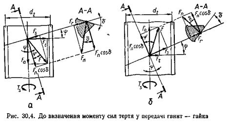 Кут δ при малих кутах підйому витків можна брати (див. рис. 30.2): для трикутних та трапецеїдальних різьб δ ≈ 0,5α; для упорних різьб δ ≈ 30, а для прямокутних різьб δ = 0. Формула (5) справедлива для випадку, коли осьова сила Fa на гвинті протилежна напряму швидкості v його поступального руху. Якщо напрями Fa та ν збігаються (див рис. 30.4, б), то вираз для визначення Ts має такий вигляд (для випадку φ' > ψ):