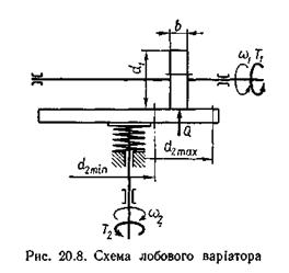 Для фрикційних варіаторів діапазон регулювання визначають таким чином. Л о б о в и й в a p і а т о p. Із умови рівності колових швидкостей точки конгакту ведучого котка та веденого диску маємо біжучі значення передаточного числа: